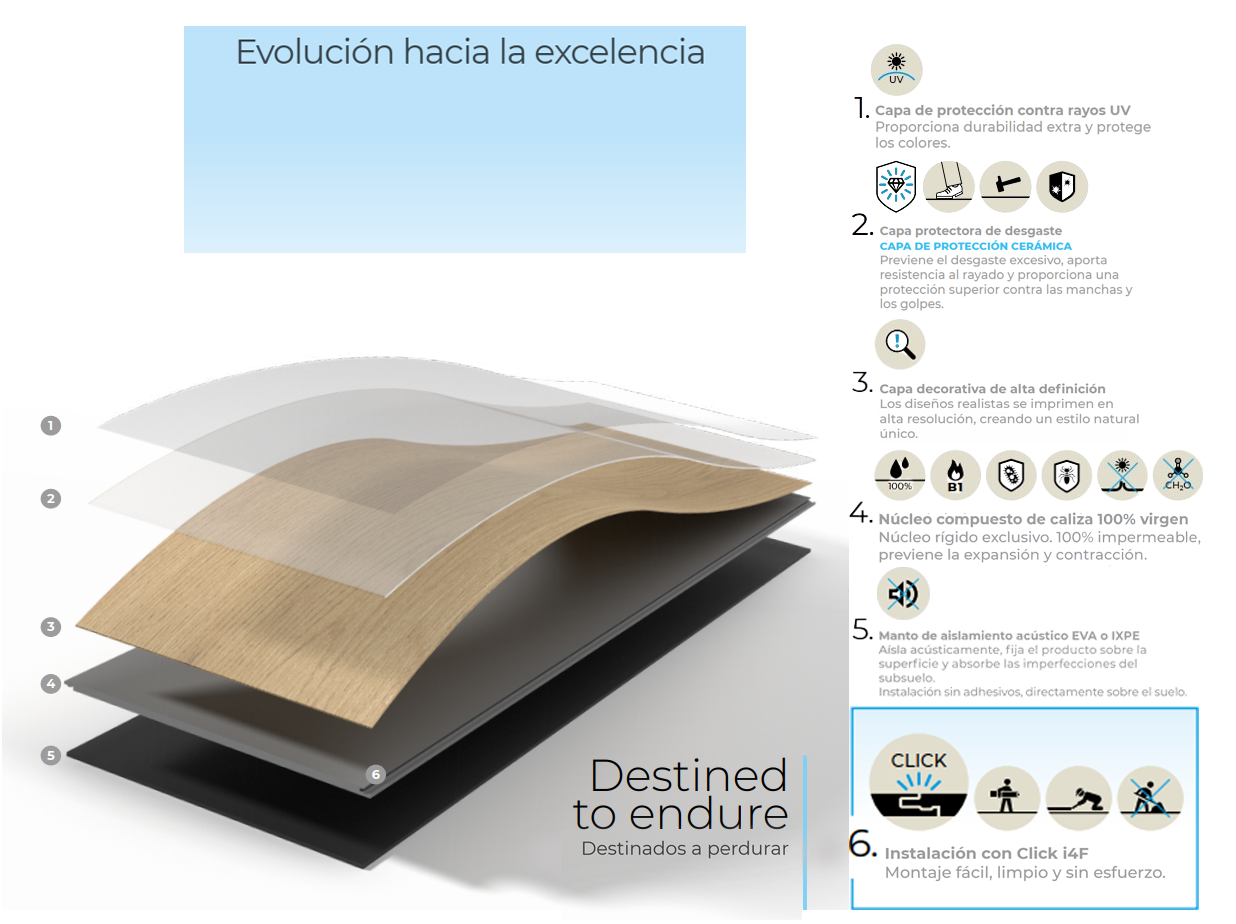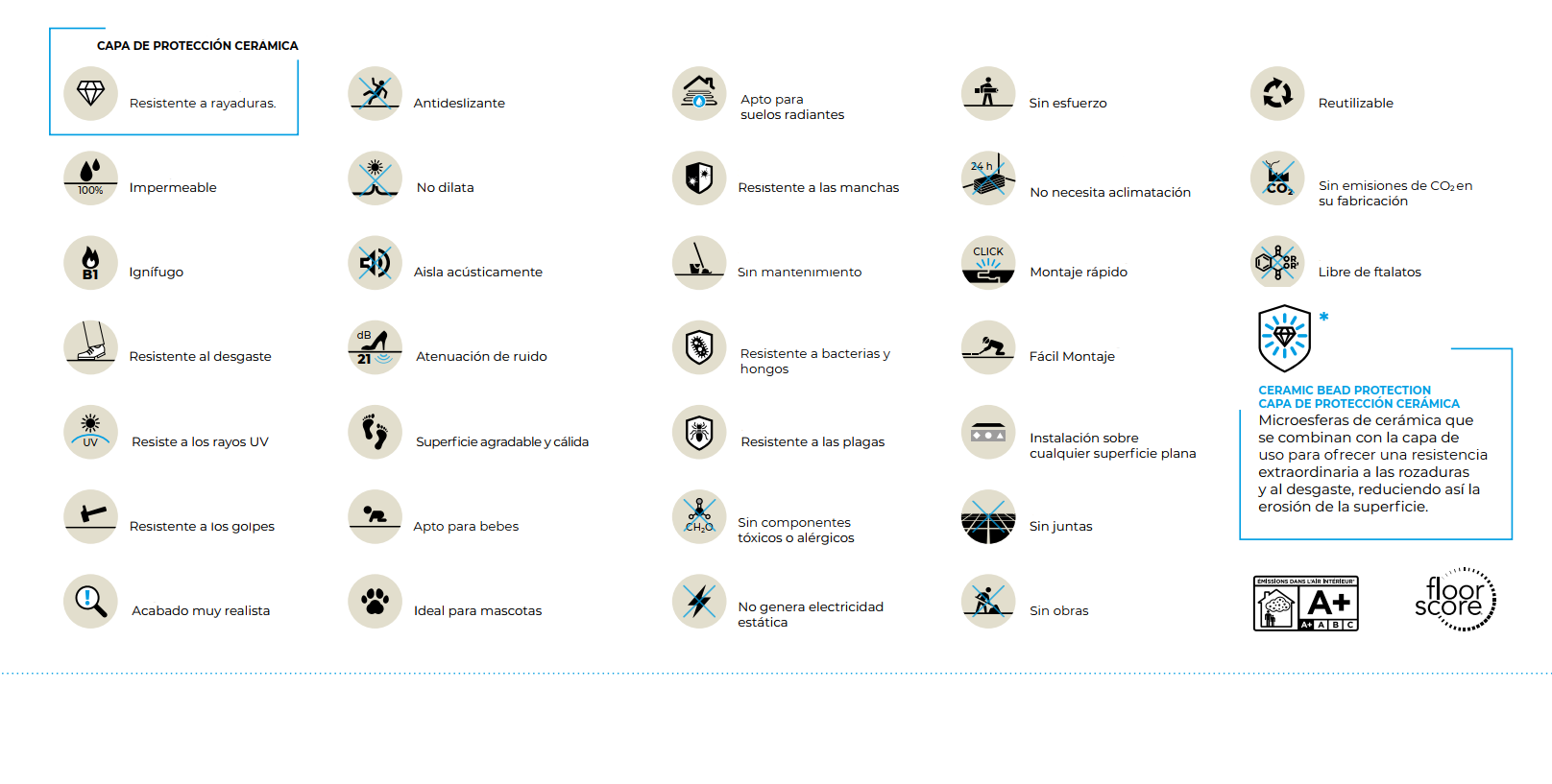 Solo tienes que echar un vistazo a estas páginas para darte cuenta de la excelencia de este nuevo producto. Son la última generación de suelos vinílicos que incluyen carbonato cálcico. Estamos muy satisfechos con su rendimiento a largo plazo. Los resultados de las pruebas realizadas lo demuestran y así lo trasladamos al consumidor, ofreciéndole una garantía casi de por vida que muy pocos se atreven a igualar.